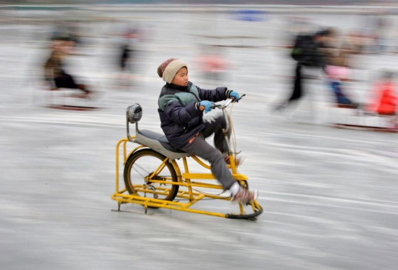 Маленький китаец на велосипеде для езды по льду, Пекин