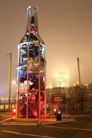 Москва. Памятник пьянству за рулем — гигантская бутылка высотой 12 метров, наполненная разбитыми автомобилями.