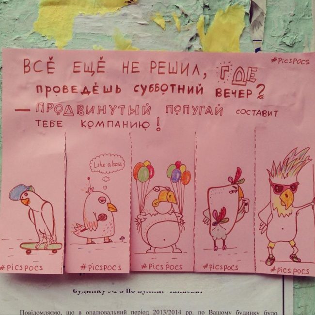 Художница Анастасия Винокурова недавно начала рисовать небольшие оптимистичные объявления, призванные поднять настроение жителям столицы. Она клеит эти объявления в разных уголках Киева, фотографирует их и показывает на своей странице в социальной сети.