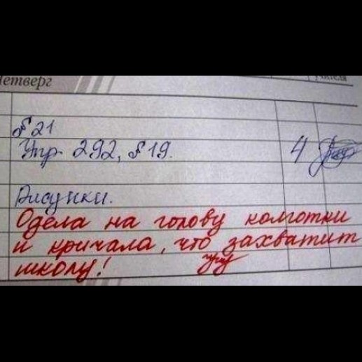 Ну, как бы да, местами смешно… Но, все-таки, ЧТО должен написать учитель в дневнике, если на доске придурок-ученик нарисовал половой орган? А другая дура надела на голову колготки?.. Жаль, но раньше дети ходили в школу учиться, а не х… рисовать.