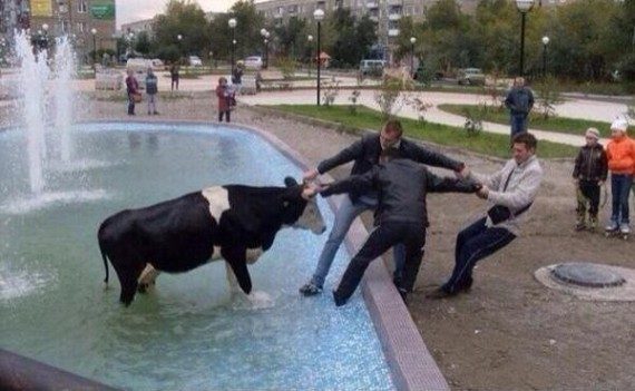 Теленок в жаркий день зашел в фонтан напиться…