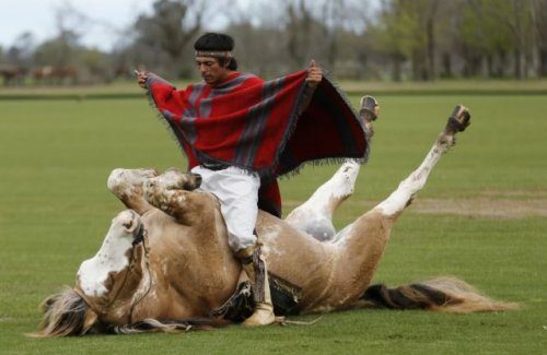 Тренер лошадей Мартин Тата (Martin Tata) сидит на своей пятилетней лошади «Примавера» (Primavera) во время демонстрации «укрощения индейцев» на ранчо «Поло Клаб Пуьесто Вьехо» (Polo Club Puesto Viejo) в Кануэлас (Canuelas), Аргентина. Тата говорит, что его методы менее насильственные и построены на гармоничных отношениях с лошадью.