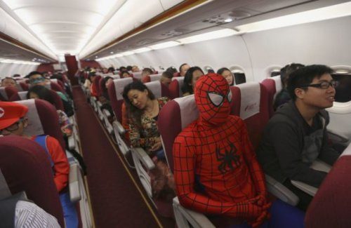 Работник компании «Lucky Air» в костюме Человека-Паука в рамках празднования Хэллоуина на борту самолёта сидит рядом с пассажирами во время полёта из Куньмина (Kunming) в Шэньчжэнь (Shenzhen) 31 октября 2014 года. По данным местных СМИ, стюардессы внутреннего рейса компании «Lucky Air» выполняли свою работу в пятницу, одетыми в костюмы супергероев и персонажей из фильмов, чтобы порадовать клиентов.