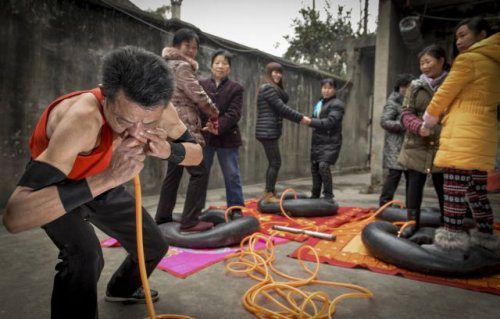 Ние Йонгбинг (Nie Yongbing) надувает шины с помощью носа, в то время как люди стоят на них в городе Чэнду (Chengdu), Китай. Ние надул четыре шины, на которых стояли восемь взрослых человек за 21 минуту во время выступления в своём доме. Традиционный китайский врач предложил Ние надувать воздушные шары носом, чтобы улучшить своё здоровье.