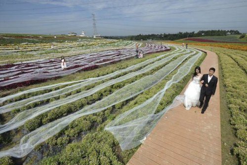 Сотрудники компании, одетые как новобрачные, проходят по тропинке, чтобы продемонстрировать шлейф свадебного платья длиной в 4100 метров, который разложен на кустах во время рекламного события 24 сентября в городе Чэнду, Китай. Шлейф стоит 6 520 долларов.