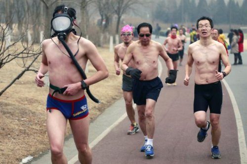 Бегун в противогазе принимает участие в «[Голом] Забеге Гуанчжоу» (Guangzhu [Naked] Run) туманным зимним утром в Олимпийском лесном парке (Olympic Forest Park) в Пекине в феврале. Главной целью события является продвижение экологичного образа жизни, однако в момент забега вышло оранжевое предупреждение о загрязнённости воздуха.
