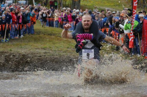 Победители Североамериканского Чемпионата по ношению жён (North American Wife Carrying Championship) Джесси Уолл (Jesse Wall) с Кристиной Арсено (Christina Arsenault). Джесси переносит жену через ров с водой на лыжном курорте, расположенном на реке Сандэй (Sunday River) в городе Ньюри (Newry), штат Мэн 11 октября 2014 года.