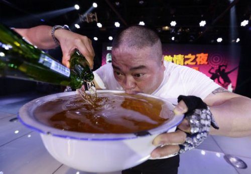 Певец пьёт пиво из огромной миски на сцене, общаясь с поклонниками после своего выступления в развлекательном клубе в Пекине в мае.