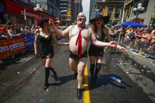 Мужчина, одевшийся в шутку мэром Торонто Робом Фордом (Rob Ford) во время Всемирного прайд-парада (WorldPride) в Торонто в июне.