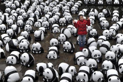 Женщина позирует для фотографий среди инсталляции панд во время выставки в Хэфэй, Китай.