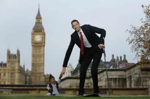 Самый низкорослый мужчина в мире Чандра Бахадур Данги (Chandra Bahadur Dangi), приветствует самого высоко в мире мужчину, Султана Кёсена (Sultan Kosen), чтобы отметить День Книги Мировых Рекордов Гиннесса (Guinness World Records Day) в Лондоне, 13 ноября 2014 года. Кёсен, чей рост превышает 2,5 метра, возвышается над Данги, рост которого равен всего лишь 57 сантиметров. В этом году Книга Мировых Рекордов Гиннесса отпраздновала своё 60-летие.