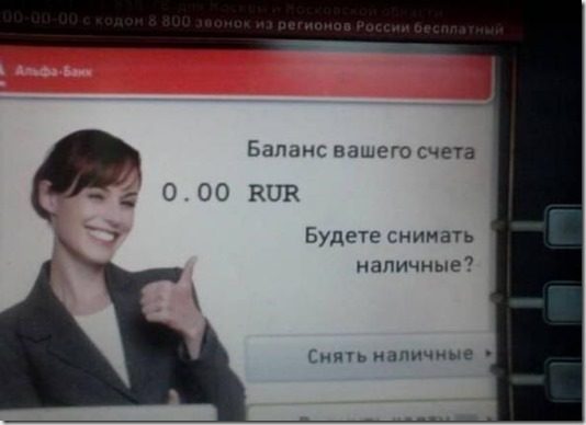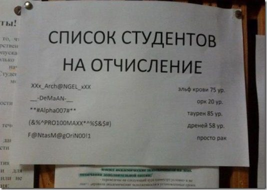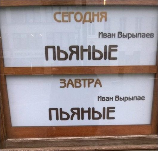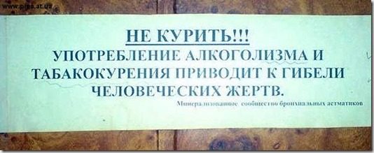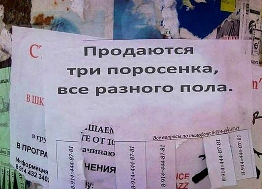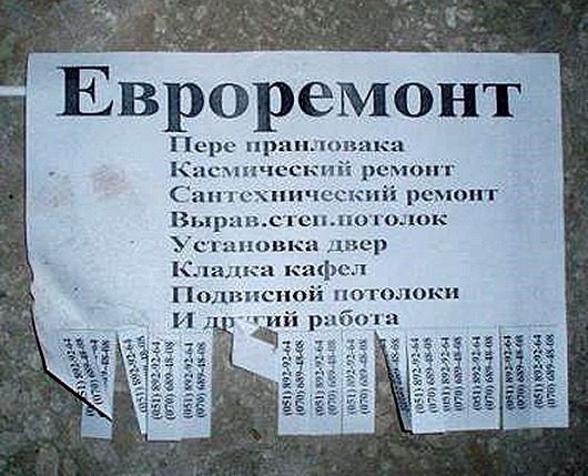 Это просто восхитительно! Я смеялся до умопомрачения. Особенно понравились: 1) объявление ремонтников, которые могут починить всё, кроме собственного звонка… 2) афиша про приключения презерватива, которые нельзя смотреть до 18 лет, а им-то как раз и надо… 3) реставрация объекта… 4) мир — труд — Wi-Fi… ----Диагноз: маразм цветёт, пахнет и махровеет на радость всем нам!