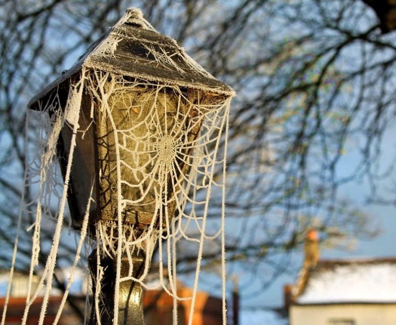 Паутина на фонаре. Подаренная природой идея оформления.