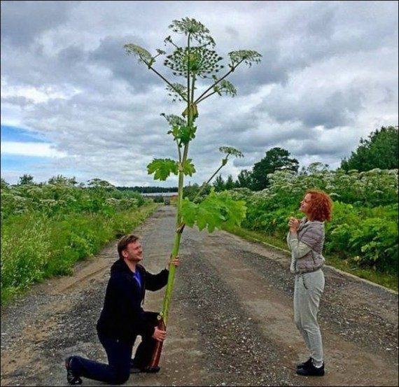 Четвётая снизу. «Цветочек» — борщевик, жгучий и ядовитый. У парня долго будут ожоги на ладонях, а девушке лучше к «цветочку» и не подходить, не то что нюхать или трогать.