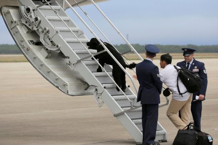 Собака Барака Обамы по кличке Санни взбирается на борт президентского самолёта на полуострове Кейп-Код в штате Массачуссетс.
