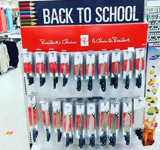 «Снова в школу» — написано над стендом. Страшно думать, откуда переехал этот мерчендайзер.