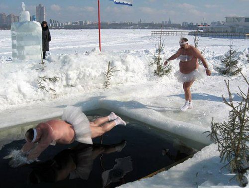 А белый лебедь на пруду ныряет в проруби во льду.