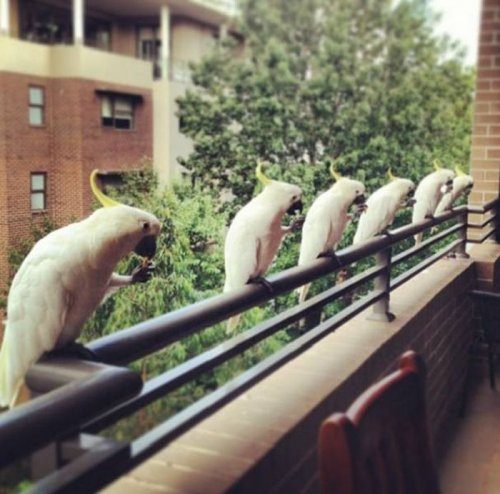 Белые попугайчики на перилах! И девушка с деньгами! Остальное тоже неплохо!