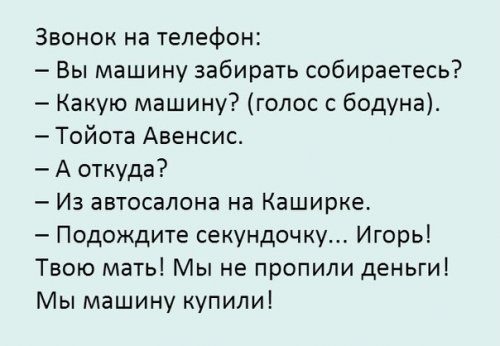 блин про машину у меня на подобе было,(обмывали копейку, в окно глянули пятёрка стоит)