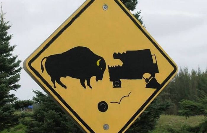 «Злые бизоны на дороге». Подобный дорожный знак можно увидеть на Аляске.