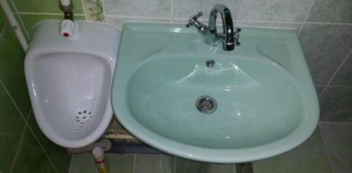 Зато хозяева сэкономили на специалистах. Жаловаться не на что. Но вот древняя жестяная раковина тут не в тему, древний кран от старости нос опустил, сантехник ни при делах.