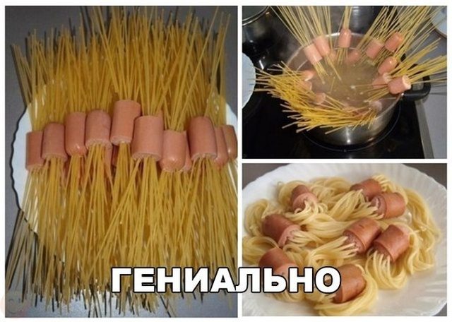Сосиски варятся максимум три минуты, потом они развариваются в нечто малоаппетитное… спагетти варится минут десять, не меньше! Ни фига не гениально…