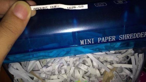 Мужчина случайно уничтожил в измельчителе бумаги квитанцию, которую ещё не внёс в свои записи. К счастью, она была достаточно узкая, чтобы он вставил её в шрёдер по горизонтали, благодаря чему нужная цифра оказалась на одной полоске.