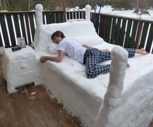 Зря молодой человек прилег на снежную кроватку. Отморозит все — придется лечиться