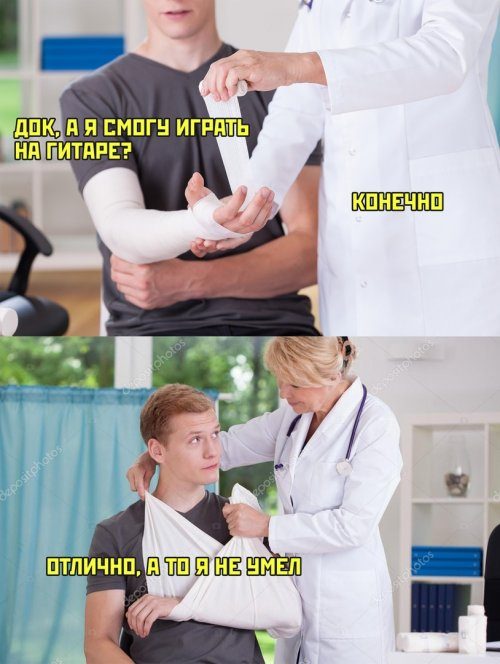 У парня, которому пообещали, что он на гитаре сможет играть, перелом на радостях на другую руку «переметнулся»)))))
