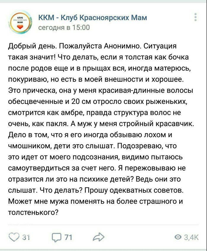 Поясню, например. Когда с первым дитём в роддом попала,- не готова была, ничего с собой не взяла от волнения, кроме стопки одноразовых стаканчиков и носков. И меня отказывались кормить совсем! Ибо, видите ли, у меня своей «нормальной посуды» нет, а в пластиковый стаканчик ни суп ни кашу наливать не желали. Взятку чтоли хотели… Но и я была нищей студенткой, и при поступлении в роддом с собою вообще никаких личных вещей брать, вроде, нельзя… А если родственники не пришли? Ко мне они только на 4й день пришли,- и принесли исключительно «запрещённые» продукты. И у меня всё это конфисковали. Короче, три дня мне приходилось питаться собственным молоком. Серьёзно. Ну у меня тогда небольшой жировой запас был, не помирала… Так что подобные вопросы- от маразматичного ужаса нашего общественного уклада, когда слабой девушке помощи и защиты просить не у кого