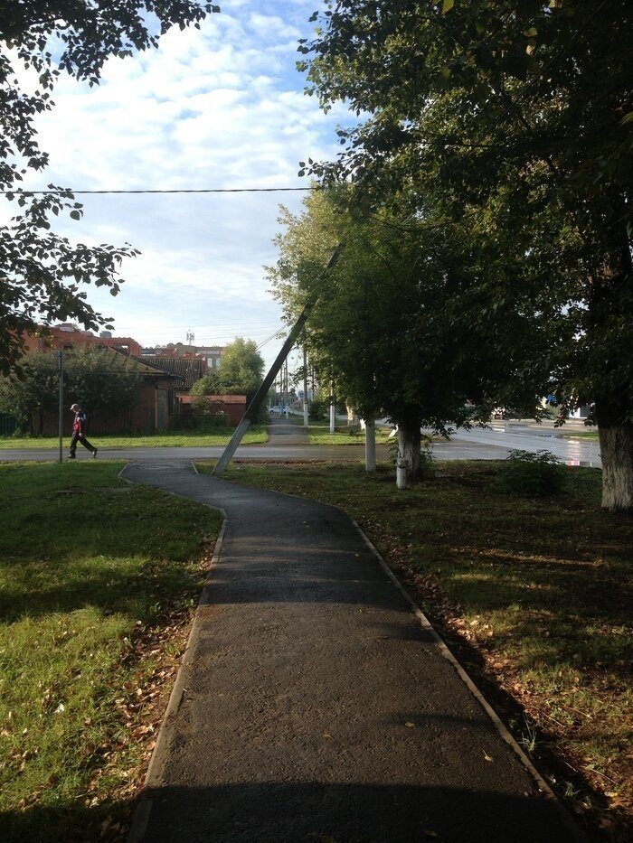 На первом фото в принципе всё логично. Рабочие предусмотрели, что если асфальтировать аллею между столбами, то народ всё равно пойдёт в обход по газону. Поэтому аллея проложена правильно ツ