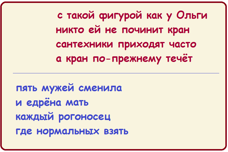 Стишок про Ольгу можно понимать двояко. Возможно, у Ольги такая сногсшибательная фигура, что все сантехники сразу начинали заниматься хозяйкой, забыв о протекающем кране :)