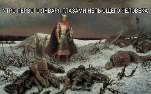 О непьющих и написано: 1 января просыпаются, едят, ложатся спать, просыпаются, снова едят. У пьющих в первый день года еда в душу не лезет (разве что слегка занюхать), а у некоторых и в последующие несколько дней не лезет :))