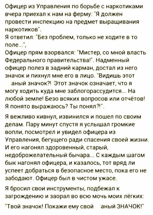 Знать бы последние мысли федерала, когда его догоняет бык, а из-за забора насчет значка прикалывается мужик :))