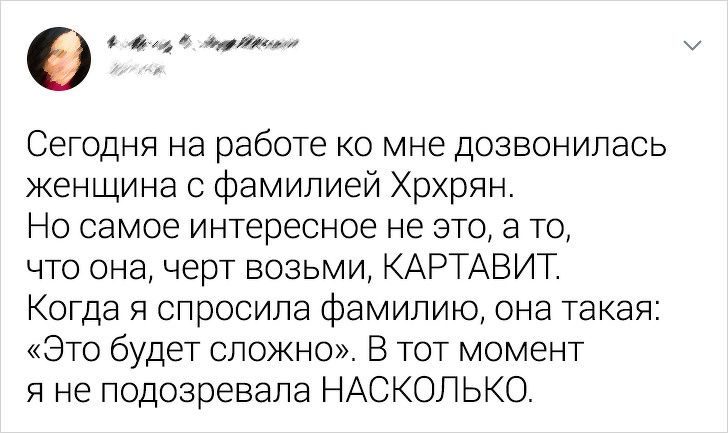 У мамы была знакомая по фамилии Криворучка, вышла замуж и стала Кривоножка. Правда, фамилию узнала его, только когда пошли заявления подавать. Если бы знала раньше, не согласилась бы даже встречаться!