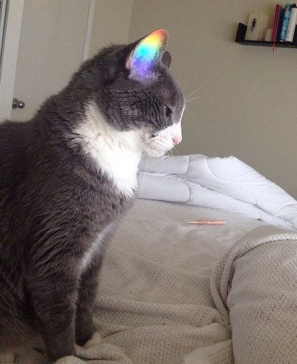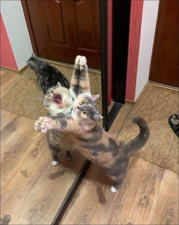 Интересное фото, где кошка в зеркале с открытым ртом, а настоящая с закрытым.