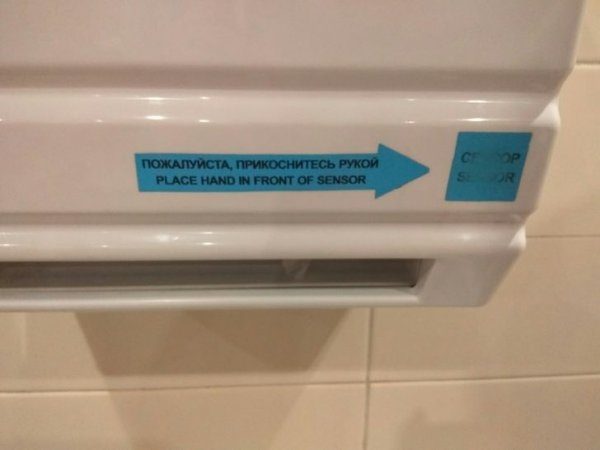 В аэропорту в туалетах висят автоматы с бумажными полотенцами. Чтобы достать полотенце, нужно поместить руку перед сенсором (как гласит англоязычная надпись)