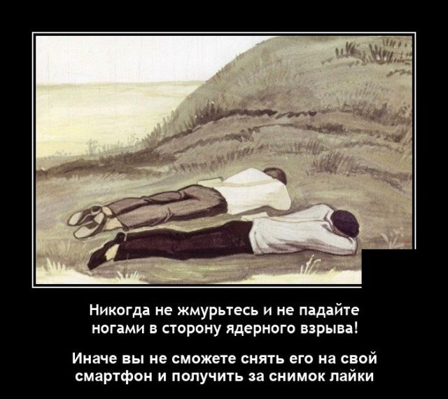 «Как быстро и дЁшево устроить, сфотать и выложить „ядерный взрыв“-ставите 3 бочки солярки друг на друга, устанавливаете толовые шашки (или еще типа ТНТ) подрываем, фотаем, выставляем куда там надо -и вуаля -лайки…