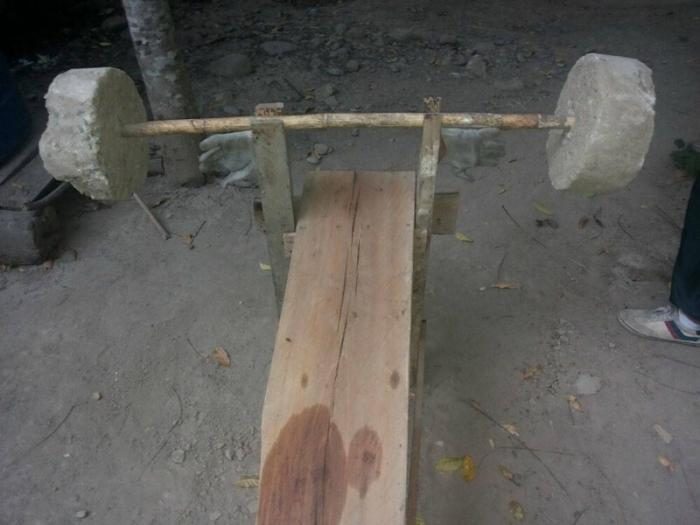 На скамейке остались следы титанических усилий по жиму лежа штанги с каменными кругами вместо блинов