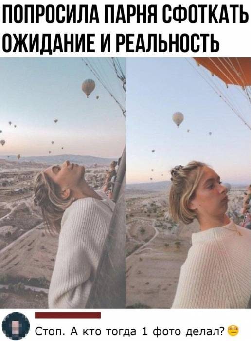 А чего непонятного? «Попросила парня сфоткать ожидание и реальность» — вот тебе две фотки, как и требовалось.