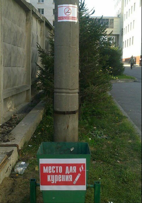 Все ясно, возле столба курить нельзя! А возле мусорного контейнера в метре от столба — можно!