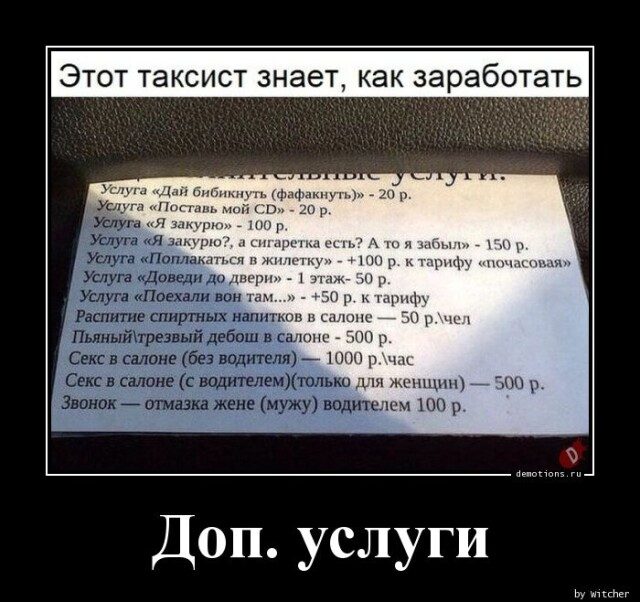 То есть, если страшная старая карга заплатит таксисту 500 р, то он будет её трахать? Ну и работа…