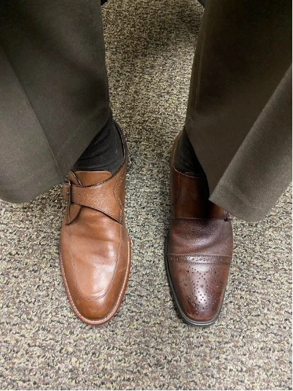 8. Я надел разные ботинки, чтобы узнать мнение жены о них, а потом забыл переобуться и целый день на работе провёл вот так